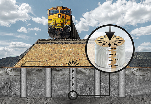 Il sistema Ringtrac®, colonne in sabbia incapsulate in geotessile (GEC), è stato sviluppato, con l’assistenza di HUESKER, come sistema di consolidamento fondazionale per opere di terra costruite su terreni molto scadenti. Il componente chiave di questo innovativo sistema di fondazione è il geotessile tessuto tubolare di rinforzo. Il sistema prevede la realizzazione di una serie di colonne disposte a maglia regolare, realizzate con materiali non coesivi, incapsulati dal geotessile tubolare, che trasmettono i carichi strutturali allo strato portante profondo. Il Ringtrac è un metodo rapido, economico e molto sicuro per realizzare fondazioni profonde per rilevati su terreni molto scadenti. In sommità delle colonne vengono poi posate le geogriglie Fortrac® o i geotessili Robutec® o Stabilenka® per garantire stabilità all’argine.