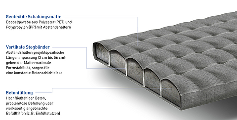 Il cuore di questo nuovo sistema ad alte prestazioni è rappresentato dal perfezionamento dei lacci verticali di collegamento, che consentono non solo la possibilità di raggiungere durante ciascun ciclo di riempimento altezze finora senza precedenti, ma garantiscono anche una distribuzione uniforme del calcestruzzo su fondi irregolari o in lavorazioni subacquee. "Grazie a un’innovativa tecnologia di tessitura e a una nuova composizione dei materiali, siamo riusciti a migliorare in modo decisivo l'Incomat Standard, il nostro modello storico. L’altezza raggiungibile a ciascun ciclo di riempimento è stata aumentata del 95% e la resistenza a trazione addirittura del 100%", spiega Simon Ebbert, Business Development Hydraulic Engineer presso HUESKER Synthetic GmbH. Rispetto ad altri materassi in calcestruzzo, l'Incomat Pro richiede inoltre fino al 35% di materiale in meno per la copertura di un metro quadrato di superficie.