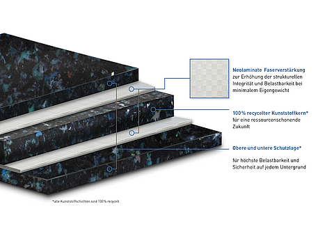 Il Basetrac Plate nasce della combinazione tra fibre Neolaminate, sviluppate dalla HUESKER, e polimeri plastici interamente riciclati. Le fibre in Neolaminate sono orientate in modo tale da massimizzare la capacità portante dell'elemento, mantenendo un peso ridotto. Con uno spessore di soli 23 mm, il Basetrac Plate è significativamente più sottile rispetto alle tradizionali piastre di ripartizione dei carichi ed è inoltre riutilizzabile. Questo sistema riesce a garantire una transitabilità uniforme anche sotto carichi intensi. Con un solo carico è possibile trasportare materiale sufficiente a coprire 1.043 m², fino a sette volte più delle soluzioni convenzionali. "La piastra carrabile Basetrac Plate combina peso ridotto, elevata capacità portante e completa riciclabilità: una soluzione estremamente vantaggiosa in termini di efficienza e sostenibilità per qualsiasi cantiere." afferma Oliver Detert, Responsabile del Dipartimento di Ingegneria della HUESKER Synthetic GmbH.